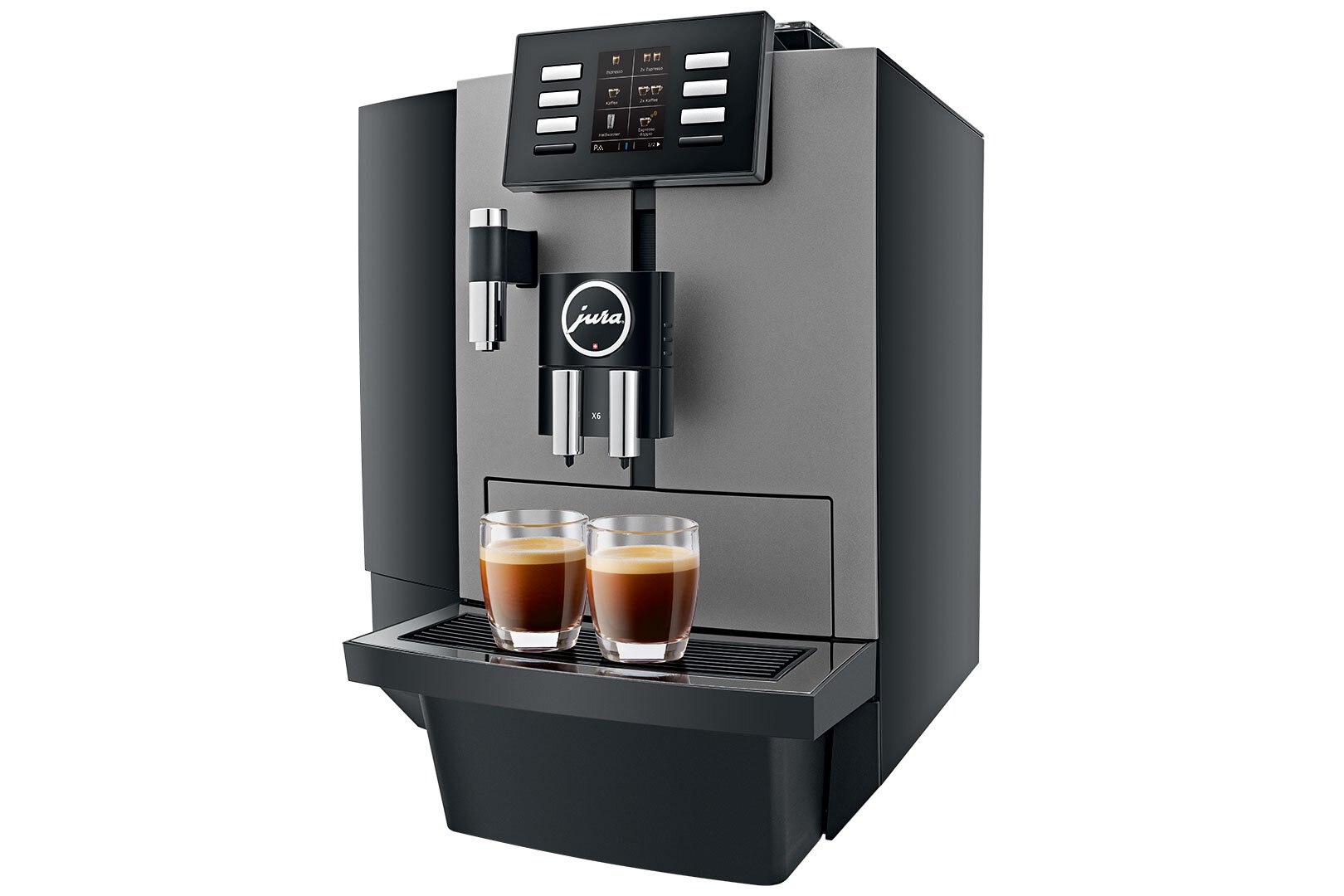 Wo Schwarzkaffeespezialitäten favorisiert, professionell Kännchenkaffee zubereitet und heißes Wasser in zwei verschiedenen Temperaturstufen für Tee zur Verfügung gestellt werden soll, spielt die Jura X6 Dark Inox ihre Stärken voll aus. Ihr klar verständliches Bedienkonzept überzeugt besonders dort, wo sie von Personal oder von Gästen selbst bedient wird. Natürlich lassen sich bei der X6 sämtliche Kaffeespezialitäten in ihrer Displayposition verändern. Mit ihrem großen Wassertank und einem nachrüstbaren, stabilen Frischwasser-Kit eignet sich die X6 für den mobilen Einsatz genauso wie an fixen Standorten.